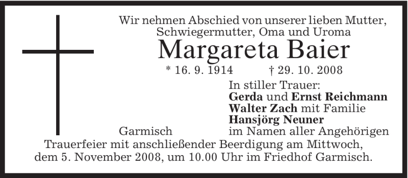 Hier finden Sie alle Traueranzeigen aus der Zeitung, die bisher für Margareta Baier erschienen sind. Weitere Traueranzeigen, die in der Zeitung erscheinen, werden hier ebenfalls aufgelistet