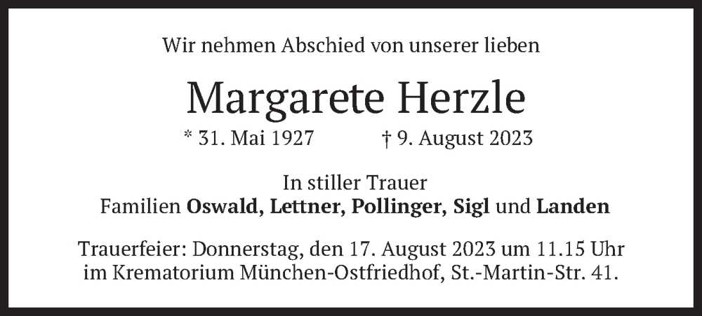 Hier finden Sie alle Traueranzeigen aus der Zeitung, die bisher für Margarete Herzle erschienen sind. Weitere Traueranzeigen, die in der Zeitung erscheinen, werden hier ebenfalls aufgelistet