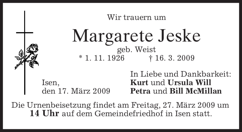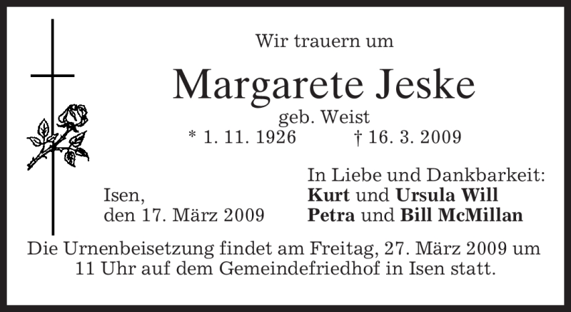 Hier finden Sie alle Traueranzeigen aus der Zeitung, die bisher für Margarete Jeske erschienen sind. Weitere Traueranzeigen, die in der Zeitung erscheinen, werden hier ebenfalls aufgelistet