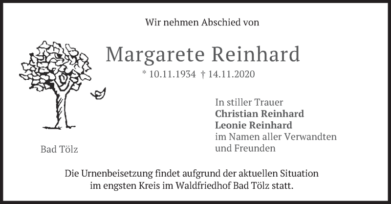 Hier finden Sie alle Traueranzeigen aus der Zeitung, die bisher für Margarete Reinhard erschienen sind. Weitere Traueranzeigen, die in der Zeitung erscheinen, werden hier ebenfalls aufgelistet