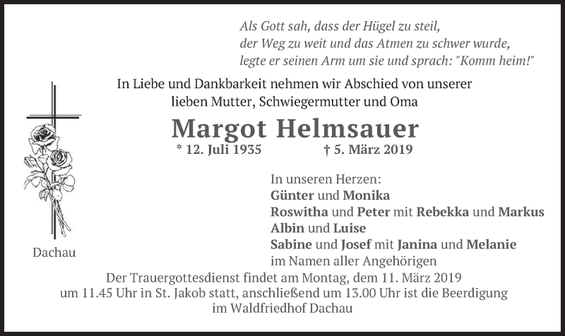 Hier finden Sie alle Traueranzeigen aus der Zeitung, die bisher für Margot Helmsauer erschienen sind. Weitere Traueranzeigen, die in der Zeitung erscheinen, werden hier ebenfalls aufgelistet