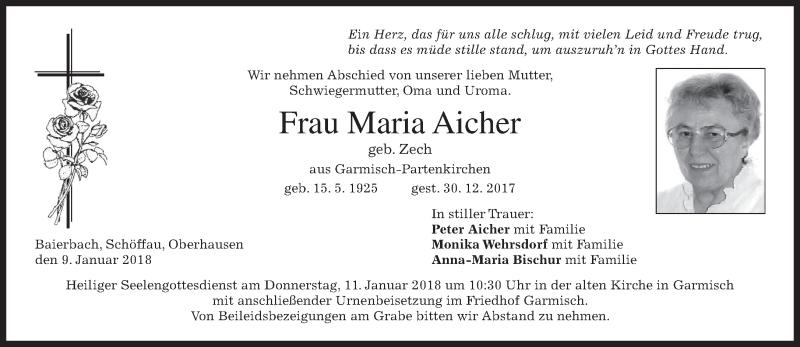 Hier finden Sie alle Traueranzeigen aus der Zeitung, die bisher für Maria Aicher erschienen sind. Weitere Traueranzeigen, die in der Zeitung erscheinen, werden hier ebenfalls aufgelistet