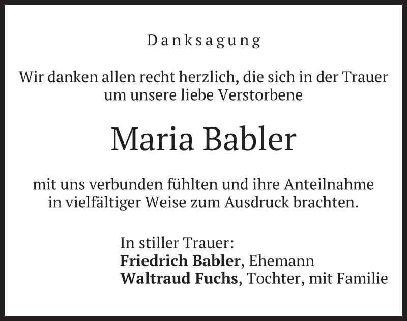 Hier finden Sie alle Traueranzeigen aus der Zeitung, die bisher für Maria Babler erschienen sind. Weitere Traueranzeigen, die in der Zeitung erscheinen, werden hier ebenfalls aufgelistet