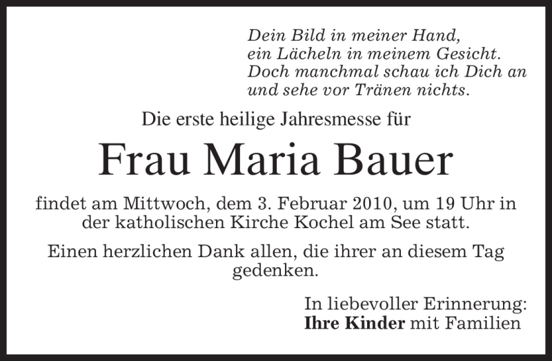 Hier finden Sie alle Traueranzeigen aus der Zeitung, die bisher für Maria Bauer erschienen sind. Weitere Traueranzeigen, die in der Zeitung erscheinen, werden hier ebenfalls aufgelistet