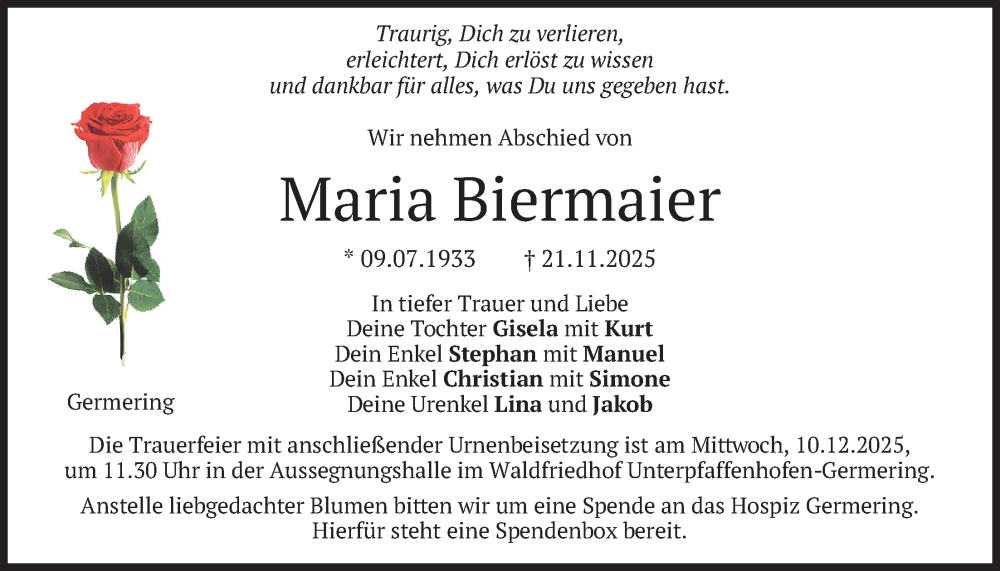 Hier finden Sie alle Traueranzeigen aus der Zeitung, die bisher für Maria Biermaier erschienen sind. Weitere Traueranzeigen, die in der Zeitung erscheinen, werden hier ebenfalls aufgelistet
