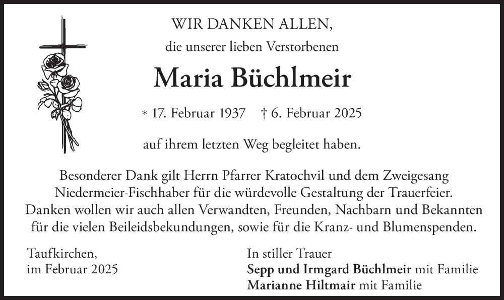 Hier finden Sie alle Traueranzeigen aus der Zeitung, die bisher für Maria Büchlmeir erschienen sind. Weitere Traueranzeigen, die in der Zeitung erscheinen, werden hier ebenfalls aufgelistet