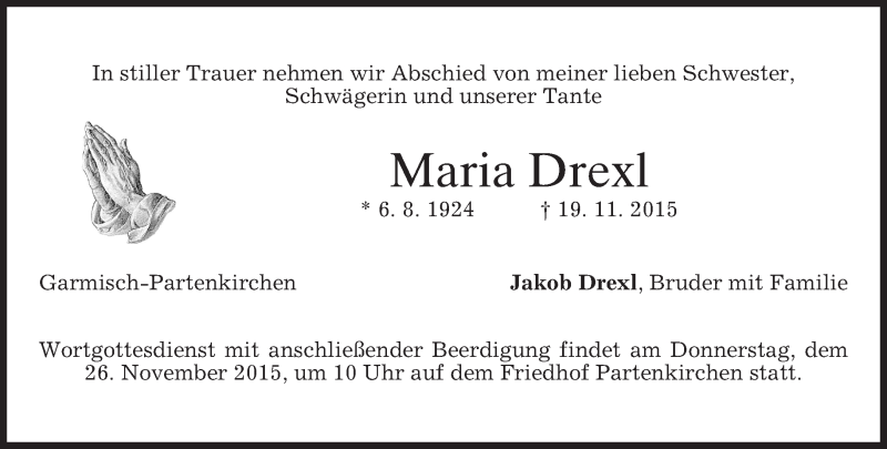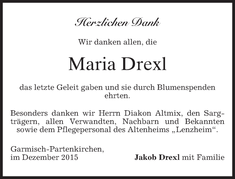Hier finden Sie alle Traueranzeigen aus der Zeitung, die bisher für Maria Drexl erschienen sind. Weitere Traueranzeigen, die in der Zeitung erscheinen, werden hier ebenfalls aufgelistet