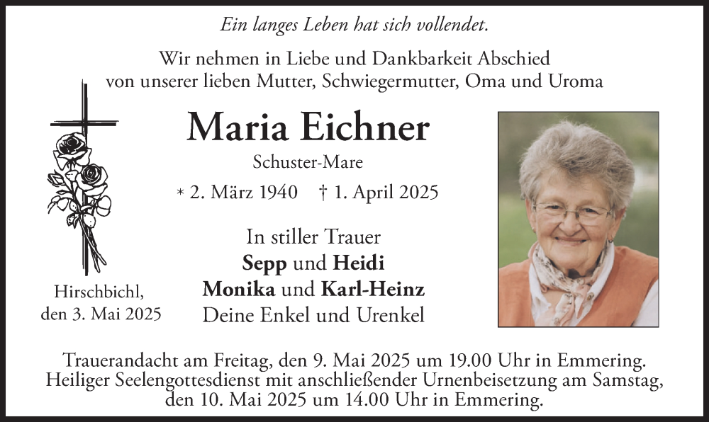 Hier finden Sie alle Traueranzeigen aus der Zeitung, die bisher für Maria Eichner erschienen sind. Weitere Traueranzeigen, die in der Zeitung erscheinen, werden hier ebenfalls aufgelistet