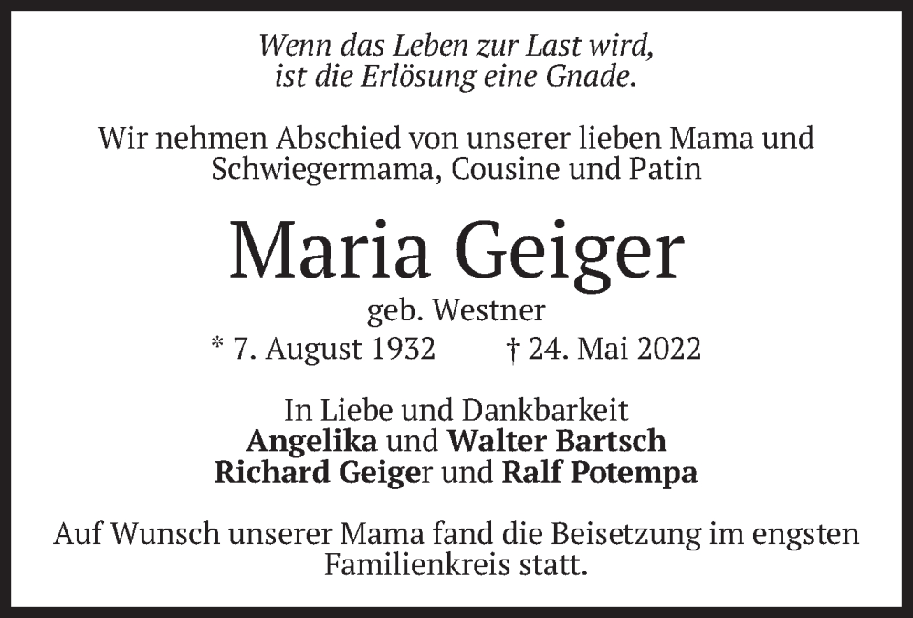 Hier finden Sie alle Traueranzeigen aus der Zeitung, die bisher für Maria Geiger erschienen sind. Weitere Traueranzeigen, die in der Zeitung erscheinen, werden hier ebenfalls aufgelistet