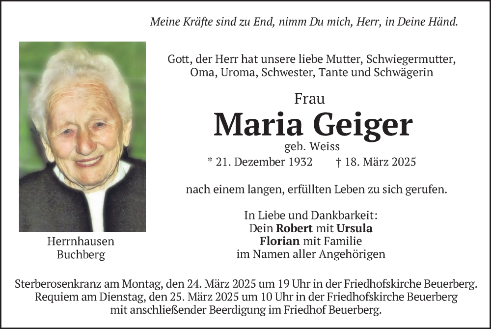 Hier finden Sie alle Traueranzeigen aus der Zeitung, die bisher für Maria Geiger erschienen sind. Weitere Traueranzeigen, die in der Zeitung erscheinen, werden hier ebenfalls aufgelistet