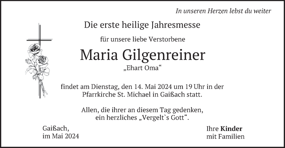 Hier finden Sie alle Traueranzeigen aus der Zeitung, die bisher für Maria Gilgenreiner erschienen sind. Weitere Traueranzeigen, die in der Zeitung erscheinen, werden hier ebenfalls aufgelistet