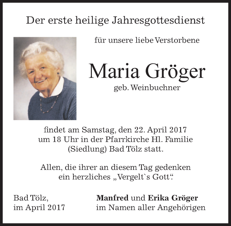 Hier finden Sie alle Traueranzeigen aus der Zeitung, die bisher für Maria Gröger erschienen sind. Weitere Traueranzeigen, die in der Zeitung erscheinen, werden hier ebenfalls aufgelistet