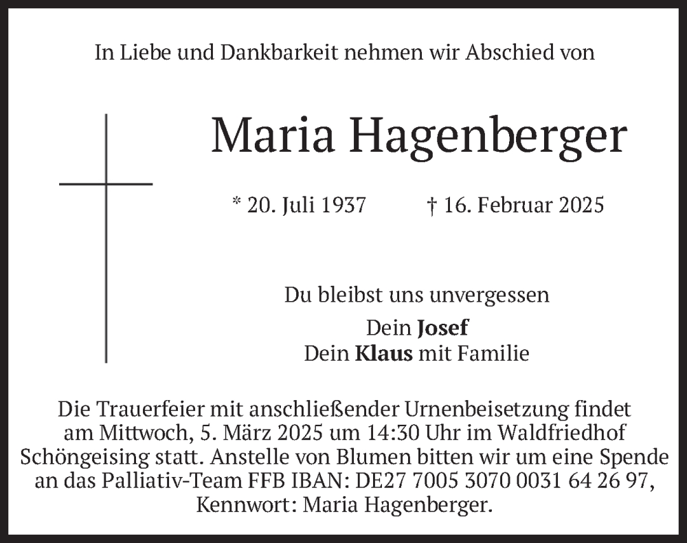 Hier finden Sie alle Traueranzeigen aus der Zeitung, die bisher für Maria Hagenberger erschienen sind. Weitere Traueranzeigen, die in der Zeitung erscheinen, werden hier ebenfalls aufgelistet