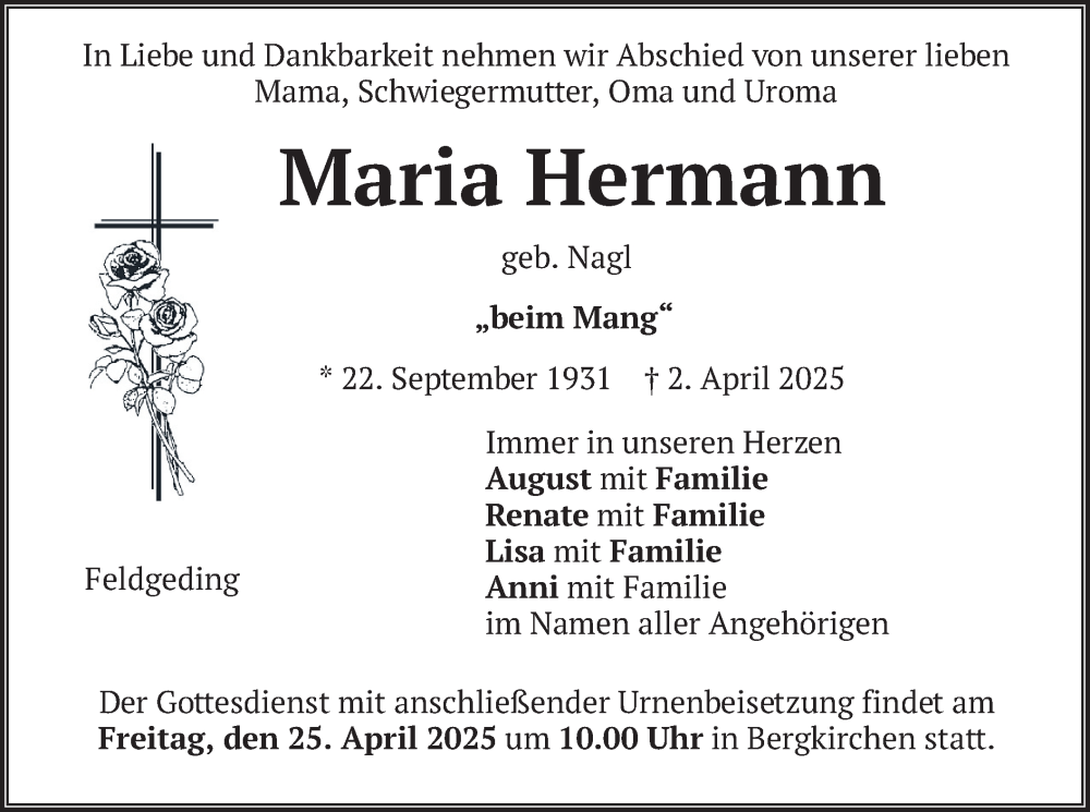 Hier finden Sie alle Traueranzeigen aus der Zeitung, die bisher für Maria Hermann erschienen sind. Weitere Traueranzeigen, die in der Zeitung erscheinen, werden hier ebenfalls aufgelistet