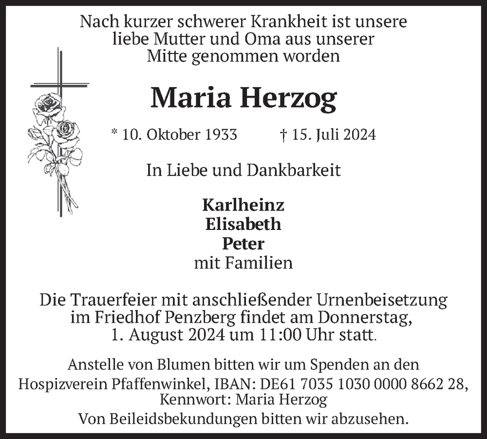 Hier finden Sie alle Traueranzeigen aus der Zeitung, die bisher für Maria Herzog erschienen sind. Weitere Traueranzeigen, die in der Zeitung erscheinen, werden hier ebenfalls aufgelistet