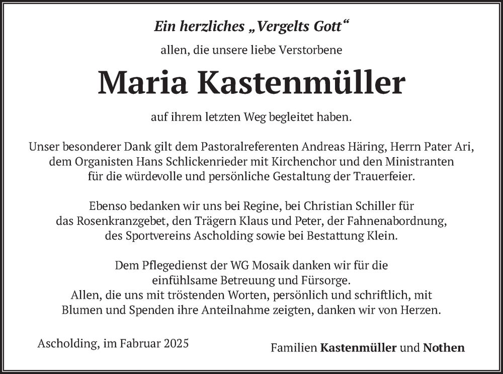 Hier finden Sie alle Traueranzeigen aus der Zeitung, die bisher für Maria Kastenmüller erschienen sind. Weitere Traueranzeigen, die in der Zeitung erscheinen, werden hier ebenfalls aufgelistet