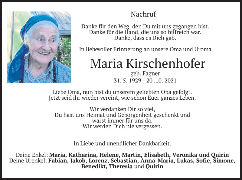 Hier finden Sie alle Traueranzeigen aus der Zeitung, die bisher für Maria Kirschenhofer erschienen sind. Weitere Traueranzeigen, die in der Zeitung erscheinen, werden hier ebenfalls aufgelistet