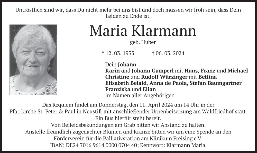 Hier finden Sie alle Traueranzeigen aus der Zeitung, die bisher für Maria Klarmann erschienen sind. Weitere Traueranzeigen, die in der Zeitung erscheinen, werden hier ebenfalls aufgelistet