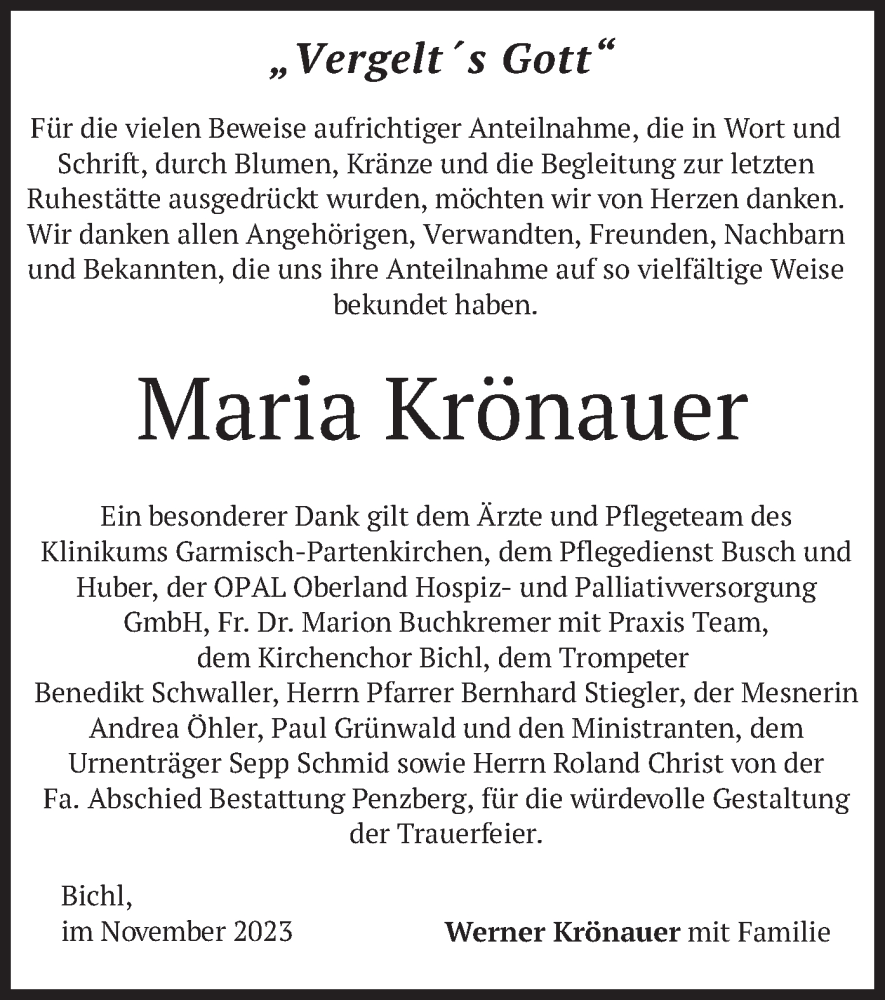 Hier finden Sie alle Traueranzeigen aus der Zeitung, die bisher für Maria Krönauer erschienen sind. Weitere Traueranzeigen, die in der Zeitung erscheinen, werden hier ebenfalls aufgelistet