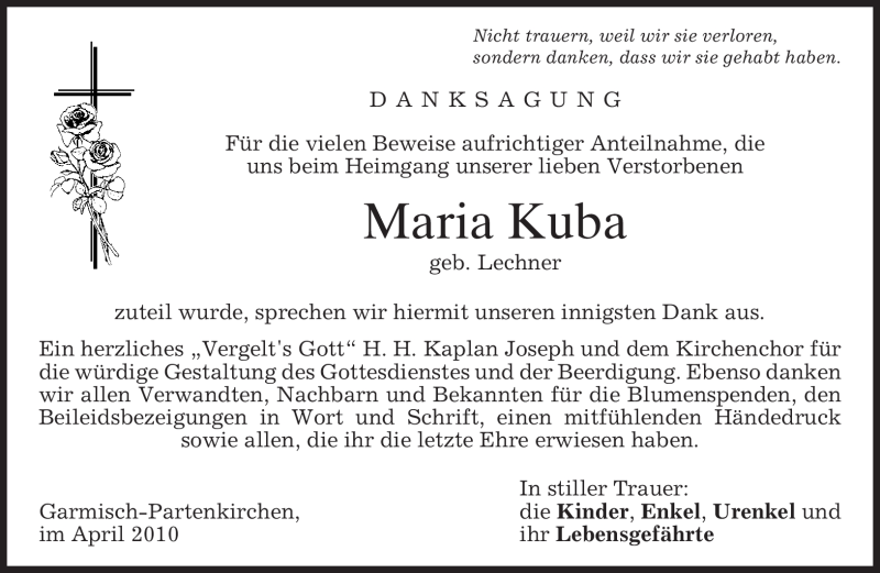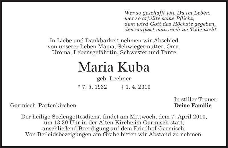 Hier finden Sie alle Traueranzeigen aus der Zeitung, die bisher für Maria Kuba erschienen sind. Weitere Traueranzeigen, die in der Zeitung erscheinen, werden hier ebenfalls aufgelistet