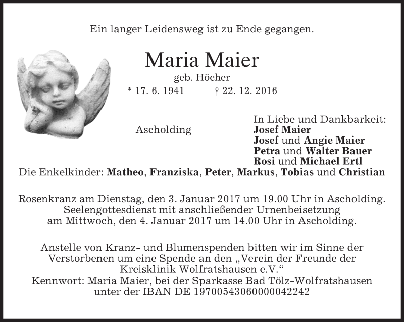 Hier finden Sie alle Traueranzeigen aus der Zeitung, die bisher für Maria Maier erschienen sind. Weitere Traueranzeigen, die in der Zeitung erscheinen, werden hier ebenfalls aufgelistet