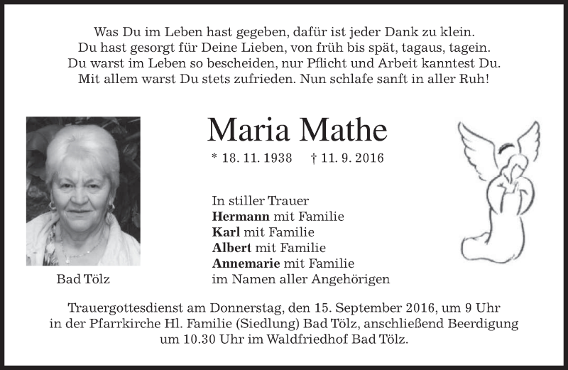 Hier finden Sie alle Traueranzeigen aus der Zeitung, die bisher für Maria Mathe erschienen sind. Weitere Traueranzeigen, die in der Zeitung erscheinen, werden hier ebenfalls aufgelistet