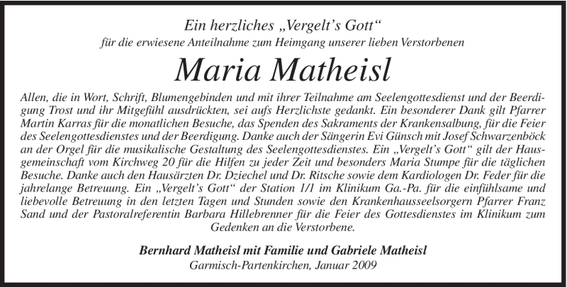 Hier finden Sie alle Traueranzeigen aus der Zeitung, die bisher für Maria Matheisl erschienen sind. Weitere Traueranzeigen, die in der Zeitung erscheinen, werden hier ebenfalls aufgelistet