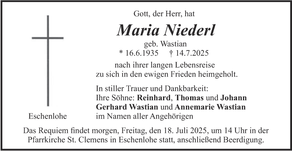 Hier finden Sie alle Traueranzeigen aus der Zeitung, die bisher für Maria Niederl erschienen sind. Weitere Traueranzeigen, die in der Zeitung erscheinen, werden hier ebenfalls aufgelistet