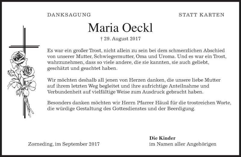Hier finden Sie alle Traueranzeigen aus der Zeitung, die bisher für Maria Oeckl erschienen sind. Weitere Traueranzeigen, die in der Zeitung erscheinen, werden hier ebenfalls aufgelistet