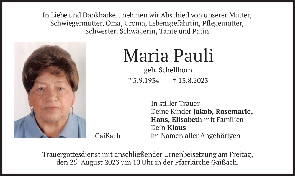 Hier finden Sie alle Traueranzeigen aus der Zeitung, die bisher für Maria Pauli erschienen sind. Weitere Traueranzeigen, die in der Zeitung erscheinen, werden hier ebenfalls aufgelistet
