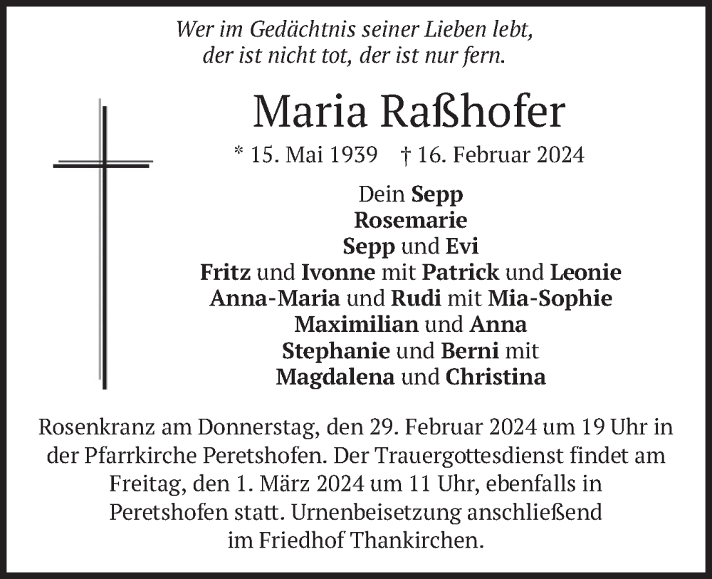 Hier finden Sie alle Traueranzeigen aus der Zeitung, die bisher für Maria Raßhofer erschienen sind. Weitere Traueranzeigen, die in der Zeitung erscheinen, werden hier ebenfalls aufgelistet