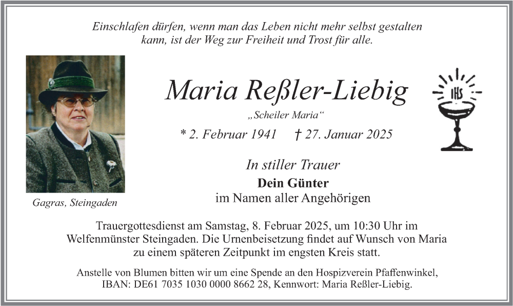 Hier finden Sie alle Traueranzeigen aus der Zeitung, die bisher für Maria Reßler-Liebig erschienen sind. Weitere Traueranzeigen, die in der Zeitung erscheinen, werden hier ebenfalls aufgelistet