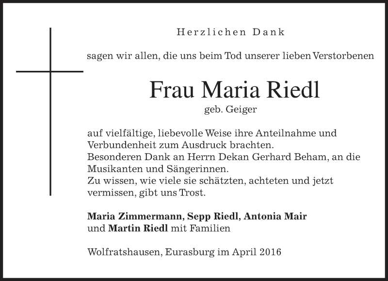 Hier finden Sie alle Traueranzeigen aus der Zeitung, die bisher für Maria Riedl erschienen sind. Weitere Traueranzeigen, die in der Zeitung erscheinen, werden hier ebenfalls aufgelistet