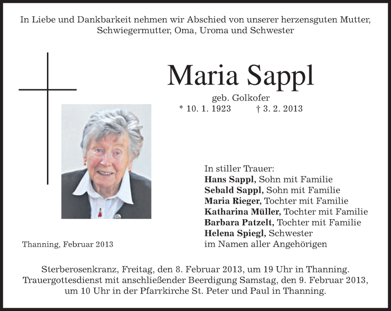 Hier finden Sie alle Traueranzeigen aus der Zeitung, die bisher für Maria Sappl erschienen sind. Weitere Traueranzeigen, die in der Zeitung erscheinen, werden hier ebenfalls aufgelistet