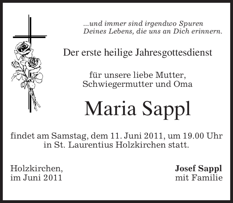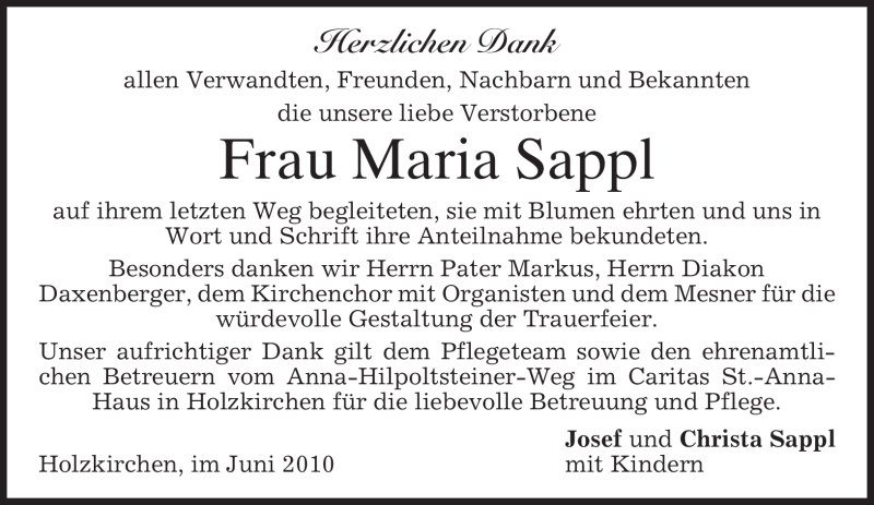 Hier finden Sie alle Traueranzeigen aus der Zeitung, die bisher für Maria Sappl erschienen sind. Weitere Traueranzeigen, die in der Zeitung erscheinen, werden hier ebenfalls aufgelistet