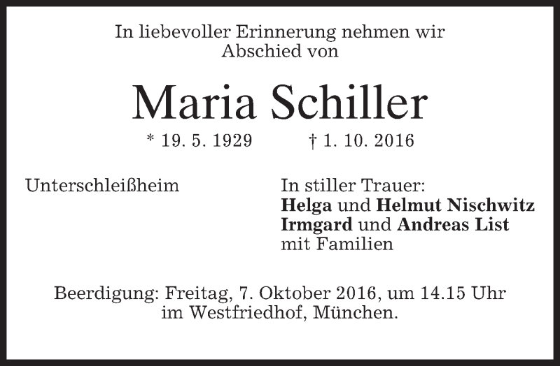 Hier finden Sie alle Traueranzeigen aus der Zeitung, die bisher für Maria Schiller erschienen sind. Weitere Traueranzeigen, die in der Zeitung erscheinen, werden hier ebenfalls aufgelistet