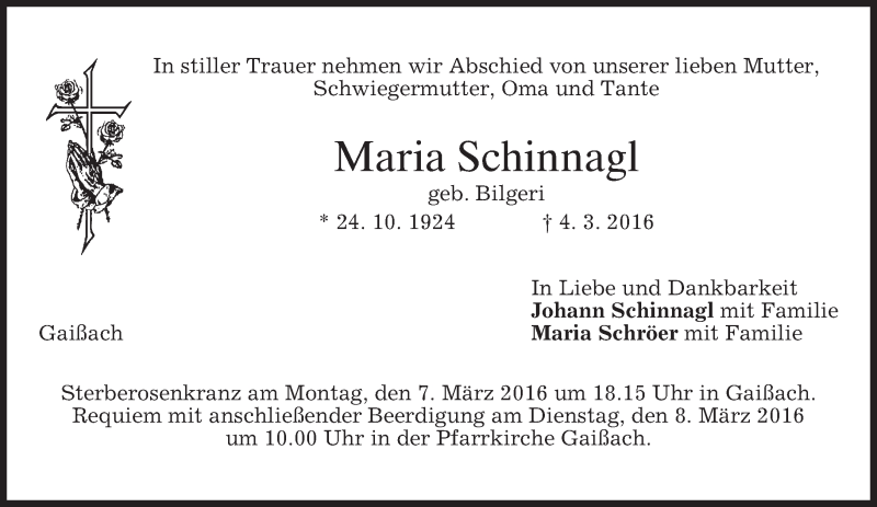 Hier finden Sie alle Traueranzeigen aus der Zeitung, die bisher für Maria Schinnagl erschienen sind. Weitere Traueranzeigen, die in der Zeitung erscheinen, werden hier ebenfalls aufgelistet