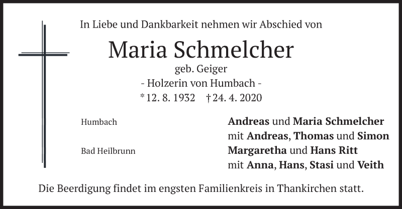 Hier finden Sie alle Traueranzeigen aus der Zeitung, die bisher für Maria Schmelcher erschienen sind. Weitere Traueranzeigen, die in der Zeitung erscheinen, werden hier ebenfalls aufgelistet