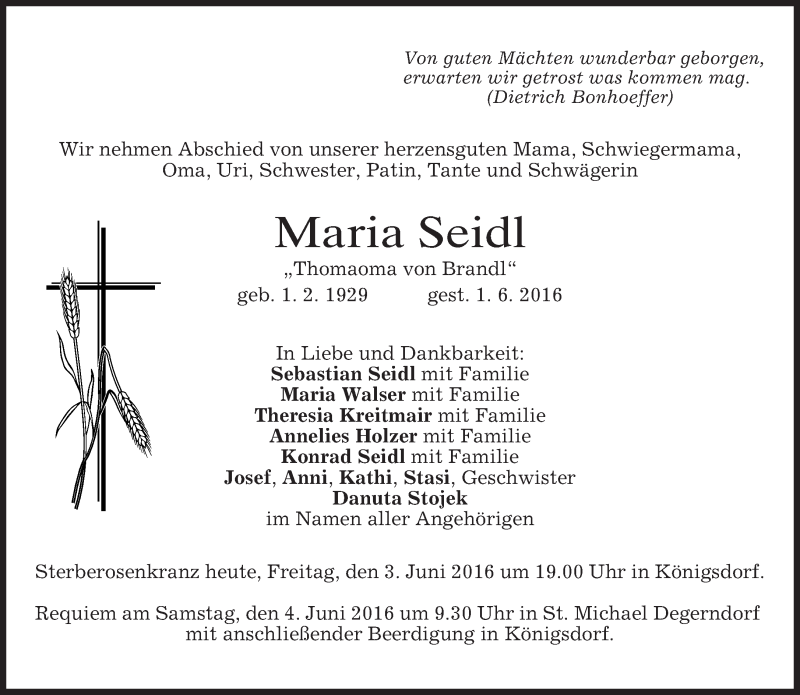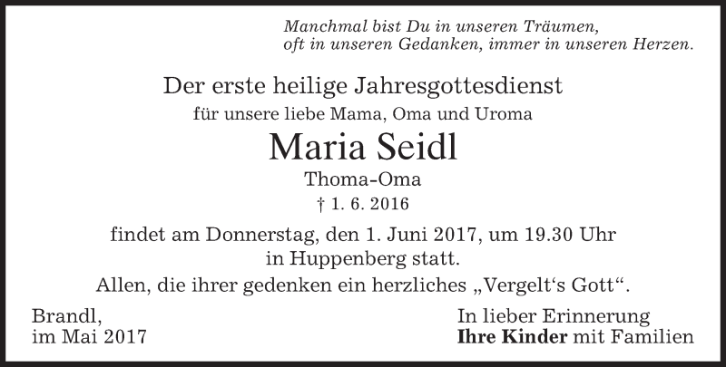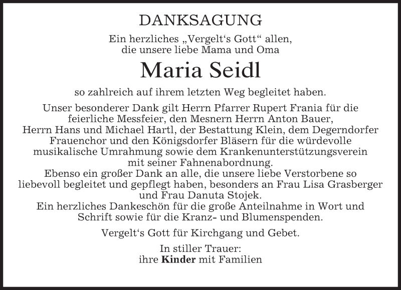 Hier finden Sie alle Traueranzeigen aus der Zeitung, die bisher für Maria Seidl erschienen sind. Weitere Traueranzeigen, die in der Zeitung erscheinen, werden hier ebenfalls aufgelistet