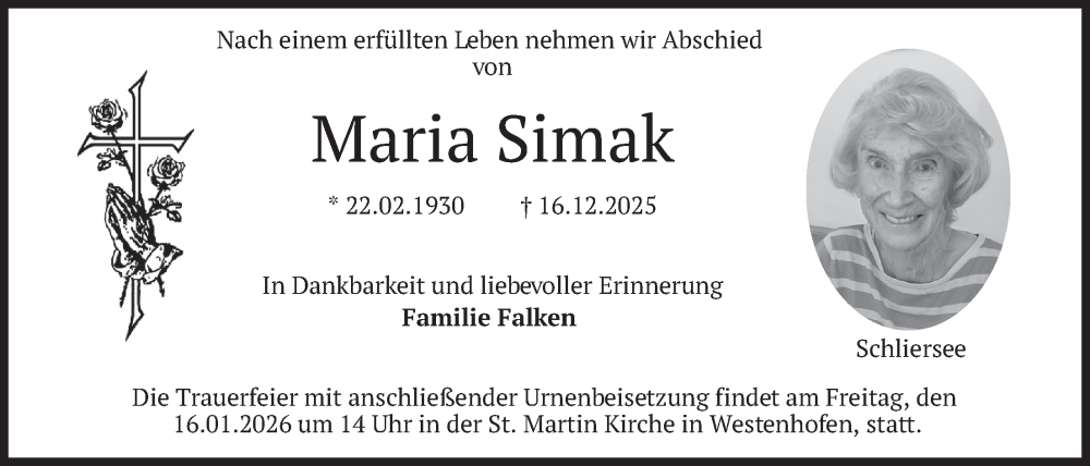 Hier finden Sie alle Traueranzeigen aus der Zeitung, die bisher für Maria Simak erschienen sind. Weitere Traueranzeigen, die in der Zeitung erscheinen, werden hier ebenfalls aufgelistet