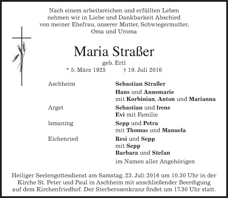 Hier finden Sie alle Traueranzeigen aus der Zeitung, die bisher für Maria Straßer erschienen sind. Weitere Traueranzeigen, die in der Zeitung erscheinen, werden hier ebenfalls aufgelistet