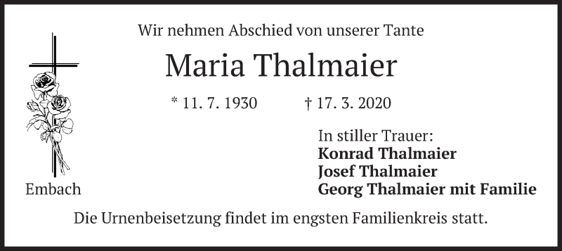 Hier finden Sie alle Traueranzeigen aus der Zeitung, die bisher für Maria Thalmaier erschienen sind. Weitere Traueranzeigen, die in der Zeitung erscheinen, werden hier ebenfalls aufgelistet