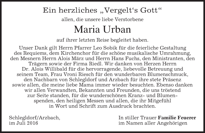 Hier finden Sie alle Traueranzeigen aus der Zeitung, die bisher für Maria Urban erschienen sind. Weitere Traueranzeigen, die in der Zeitung erscheinen, werden hier ebenfalls aufgelistet