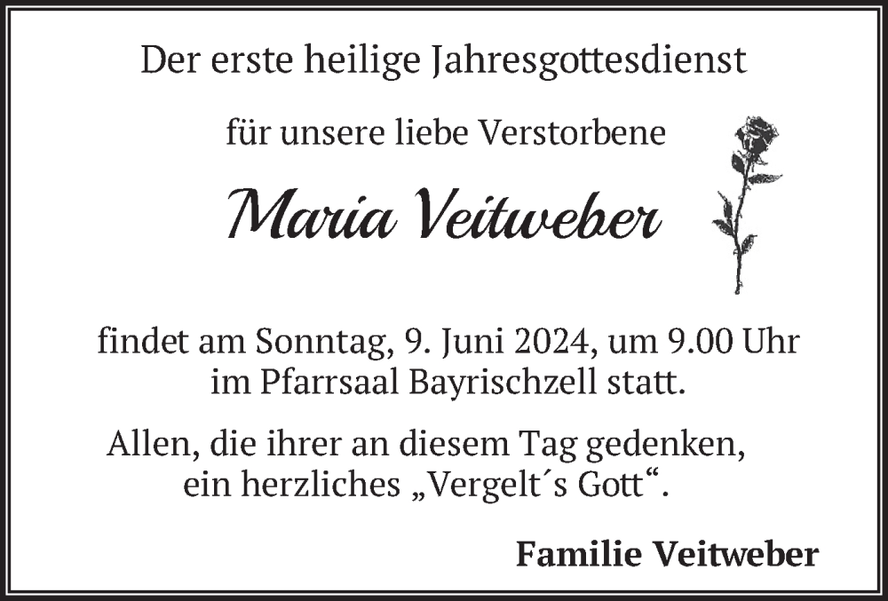 Hier finden Sie alle Traueranzeigen aus der Zeitung, die bisher für Maria Veitweber erschienen sind. Weitere Traueranzeigen, die in der Zeitung erscheinen, werden hier ebenfalls aufgelistet