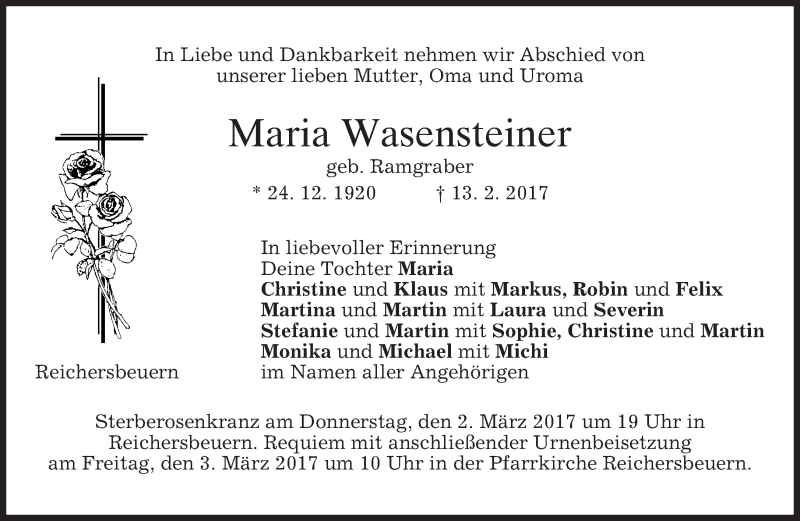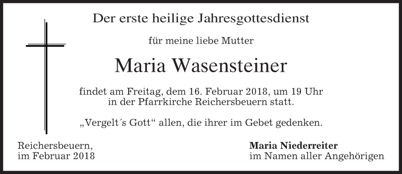 Hier finden Sie alle Traueranzeigen aus der Zeitung, die bisher für Maria Wasensteiner erschienen sind. Weitere Traueranzeigen, die in der Zeitung erscheinen, werden hier ebenfalls aufgelistet