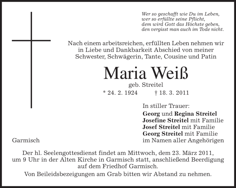 Hier finden Sie alle Traueranzeigen aus der Zeitung, die bisher für Maria Weiß erschienen sind. Weitere Traueranzeigen, die in der Zeitung erscheinen, werden hier ebenfalls aufgelistet
