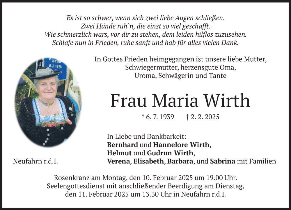 Hier finden Sie alle Traueranzeigen aus der Zeitung, die bisher für Maria Wirth erschienen sind. Weitere Traueranzeigen, die in der Zeitung erscheinen, werden hier ebenfalls aufgelistet