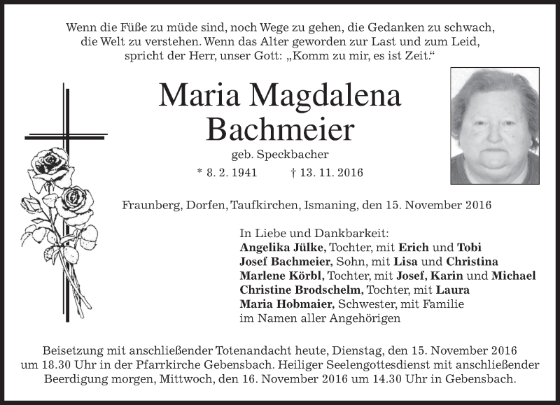 Hier finden Sie alle Traueranzeigen aus der Zeitung, die bisher für Maria Magdalena Bachmeier erschienen sind. Weitere Traueranzeigen, die in der Zeitung erscheinen, werden hier ebenfalls aufgelistet