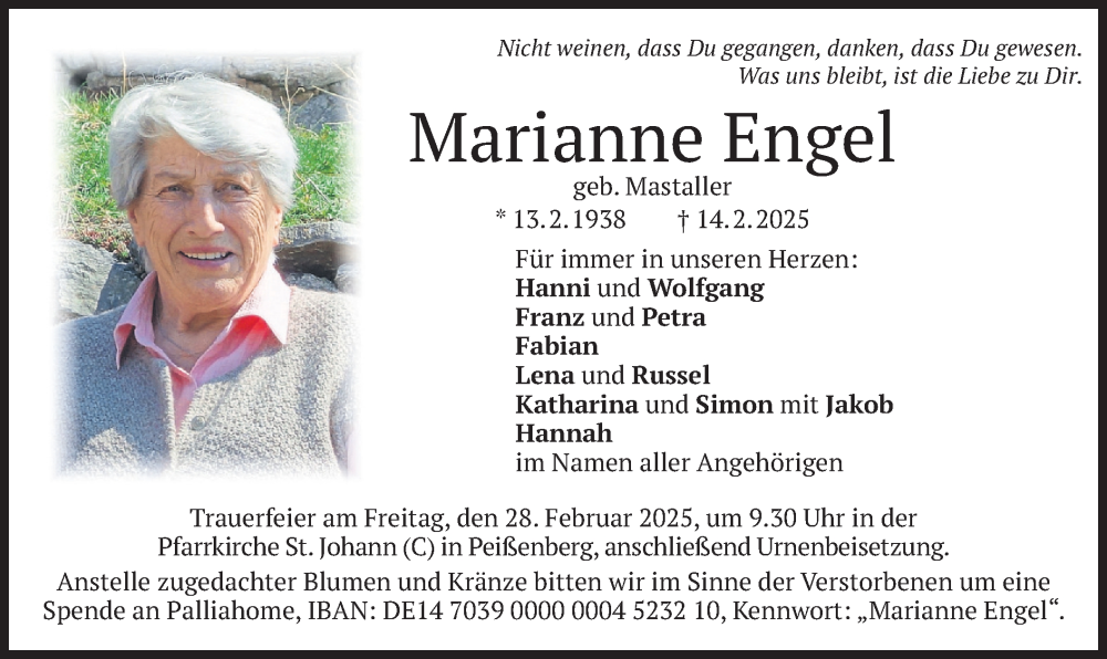 Hier finden Sie alle Traueranzeigen aus der Zeitung, die bisher für Marianne Engel erschienen sind. Weitere Traueranzeigen, die in der Zeitung erscheinen, werden hier ebenfalls aufgelistet