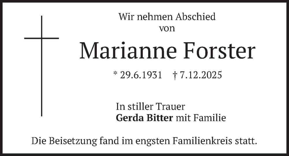 Hier finden Sie alle Traueranzeigen aus der Zeitung, die bisher für Marianne Forster erschienen sind. Weitere Traueranzeigen, die in der Zeitung erscheinen, werden hier ebenfalls aufgelistet